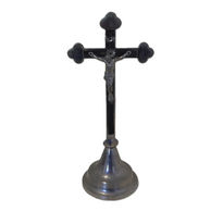 The well-made design features a multi-part construction of crucifix form, hand-made made from cast/stamped white metal, brass loop and ebonised wood. The nicely-detailed figure of Christ has His head surrounded by a Crown of Thorns (with corona), with stylised ‘INRI’ plaque above and Skull of Golgotha below (the reverse having a different Crown of Thorns). These are all held by a series of small pins. Reflecting its hand-made nature, of interest is the mounting hole being off-centre.