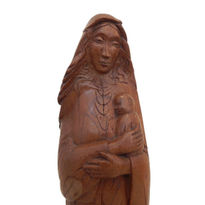 The design itself features an elongated, robed woman holding an infant within her closed arms. Mounted on an ovoid base, the craftsperson has taken great care to utilise the original, angled form of the timber for the main body (which from the side gives a ‘moving forward’ dynamic) and skill to impart a high level of detail. The robes drape with their natural weight, while at the same time emphasise the idea of movement. The human form is well-captured with subtlety and nuance, the woman’s face having particular attention to her hair (which flows around both sides of the hood) and expression that is warm, gentle and knowing.