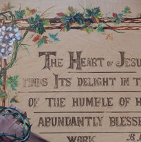 The design features a mixed media (oil and ink) polychrome design applied to a heavy brown card, the ground being left undecorated. A central rectangular, stylised eight-part wooden frame supports an entwined uppermost fruiting grapevine and angled crucifix with lower Crown of Thorns. This surrounds hand-applied calligraphic text: ‘The heart of Jesus finds its delight in the service of the humble of heart & abundantly blesses their work. B.Margaret Mary.’.