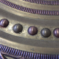 The design features a series of inset silver and copper pressed panels surrounding a central inset silver boss. The central boss depicts a reclining rajah (on a bed with stylised floral support) surrounded by rich drapery and holding a large panchapatra panchapatram vase – so he may be conducting the Hindu puja (पूजा ) ceremony. Working outwards from this scene, there are two inset textured copper bands that lead to series of rising steps. The middle step has fifty-six (56) individual domed circular copper and brass beads, each framed with round punch-marks. The outer step (which gently angles backwards to meet the rolled rim) contains five silver and five copper repeated inset panels with a stylised peacock and foliage.