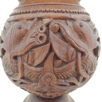 The high-quality design features a two-part balluster vase form with extensive relief and surface carving, including fantastical stylised dragons and foliate elements. Set on a stippled ground within a bamboo border, gadrooning and foliate collars the main body has two sinuous, snarling dragons appearing in combat over a small flower – each having incredible attention to detail (including extensive notchwork over their entire bodies) and small red cabochon eyes. One dragon’s body surrounds a twice-repeated representation of the ‘combat’ flower; the other has a single repeat, each being slightly different in detail. Framed within further notchwork and foliate borders, the lid has a single dragon (with red cabochon eye) swirling around a central flower boss and finely-turned button terminal.