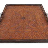 Inspired by 19th Century examples, the design features a low square form with side galleries. A central stylised flower is framed within a square, surrounded by a repeated border of flowers that mimic this. There is notch-work as well as extensive stippling of the relief to create a textured ground. Two galleries have repeated lozenges, the other spaced stippling to perhaps suggest bamboo. Set on six small turned wooden feet.