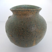 Obviously created by a highly skilled potter, its ovoid form is very unusual and stands out. The deep sea-green salt glaze is wonderfully tactile and accented by a series of raised circular points. You can’t help wanting to touch it!