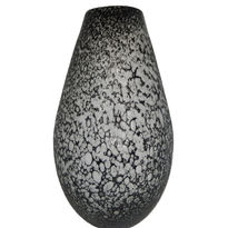 The design features a tall multi-layered, bulbous body (starting with a core of deep purple/black glass, then white, clear and a final black glass overlay). The outer layer has then been subject to an acid (or other glass-blowing treatment) to create a randomly-textured ‘spatter pattern’ finish that offers multiple ways of viewing/enjoying this unique piece.