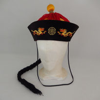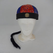 - Black, blue and red cloth (lined with red cloth) on card, Qing Dynasty-style ‘Landlord’ cap with an embroidered ideogram on a black cloth ground. Size 60.
