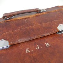 In very good overall condition. The leather was treated to two coats of industry-standard restorative wax to nourish and preserve. Being a used item of vintage luggage there is light marking, some colour-lift on one of the hinged ends and a very small tear to the hidden lift-flap (both as pictured), which you could re-dye and reglue if felt necessary. Details of a previous owner remain in place and have been left in respect of this item having a history and not being a modern reproduction.