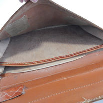 Constructed in quality stitched brown leather with English-made ‘Cheney’ fittings (that latch properly, and provide three width settings - depending upon what you’re carrying). Has two pockets, offering handy storage options as would easily fit a laptop or mobile device. Over time and with use, this has developed the most wonderful patina. There are repairs, wear marks and some separation (which could be repaired if desired). This has resulted in an utterly unique look – no one will have an example like this.