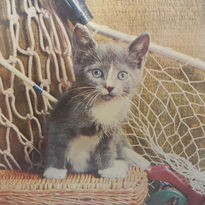 Titled ‘Kittens’, the charming design features two slightly bemused (or terrified, take your pick) grey kittens placed in an imaginary bucolic seaside shanty/cottage/pier.