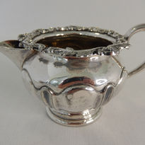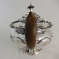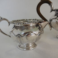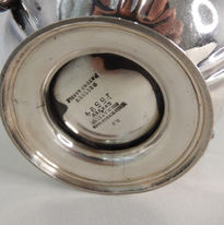 In good original condition, there is some patination and gentle wear to be expected of antique silverplate and one very small area of loss on one creamer handle (as pictured). The wooden teapot finial has been carefully reglued (by a previous owner).