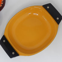 The heavy enamelled serving plate is superbly made, with practical bakelite-style handles that allow for hot foods as well as cold (when walking to the spa of course lol). Measures 25cm (l) x 17.5cm (w) x 3cm (d) approximately. Please note one handle has a very small mark (as pictured).