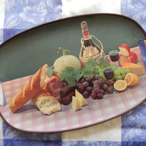 The second is a pressed masonite serving/carry tray, decorated with a classically kitsch imaginary picnic spread. Delicious. Measures 45cm x 30cm approximately. In very good overall condition, please note a very small crack (as pictured) that doesn't affect its function.