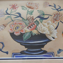 Using a bold colour palate, the artist has created a stylised image of a large blue urn (on pedestal) filled with flowers and flanked by two separate garlands each supporting a small bird. The flowers are a potential mix of poppies, primrose, roses and daises. The work shows an overall Aesthetic Movement/Arts and Crafts/Neoclassical Revival style that could possibly place it as late Victorian-era. It may be influenced by artists such as Archibald Knox and William Morris and images of Ancient Roman or Greek mosaics.