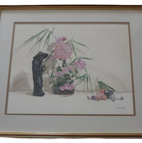 This charming mixed media still-life reveals both Jan’s skill and training (as a graphic illustrator) as well as artistic creativity. At the centre sits a large Ikebana display of pink Chrysanthemum, providing our core focus point. This then allows the viewer to discover and appreciate the other objects – to the left a statue of a Chinese Scholar, to the right an unusual silver-chained bowl with brightly-coloured Chinese doll draped across. The level of detail is extremely high, with excellent emphasis on light and shadow.