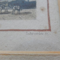 The second etching is also by Moyreau after another Wouwerman work. Published in 1749 and titled, ‘L’abreuvoir Hollandois’ (The Dutching watering place/hole (or waterers/bathers)). Translated the title reads, ‘Engraved after an original painting by Pieter Wouwerman of twenty-one inches six lines wide, about seventeen inches high. Which is in the room of Monsieur De La Haye tax farmer [collector]. 1749. With the privilege of the king.’. Despite extensive research, the original work by Wouwerman cannot currently identified, however the De La Haye mentioned is most likely Marin De La Haye (1684-1753). Set in a township landscape, next to a bridge a diverse group of people and animals are doing domestic chores, watering themselves or bathing. New arrivals (soldiers and lookers-on) appear to be either waiting their turn or about to take the plunge! A busy scene with lots of action.