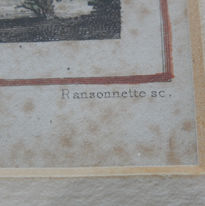- The first depicts Château de Biron (located in the Dordogne départment). Etched by Christian Daniel Rauch and printed by Pierre Nicolas Ransonette. What is particularly charming about this work is that the artist has depicted themselves seated whilst viewing the castle to complete their design (mind you their assistant has to stand). There’s also two figures depicted on the outer walls – viewing the artist/viewing the castle/viewing them! So a nice touch of humour along with its excellent detail.