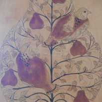 In great detail using an Arts and Crafts style, Roy has skilfully crafted a charming scene of two partridges in a … pear tree of course! The high level of quality found in this work would have taken many hours to create - I love the whimsical touch of realism with the falling leaf. Beautifully mounted in an arched frame.