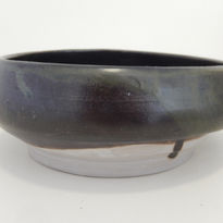 Whether deliberate or accidental, the eye-catching and fun design features a low, broad bowl form created from white clay. With the body all slumped and wobbly, I call this ‘drunken pottery’. Over this has been applied a heavy drip glaze in dark green and brown tones.
