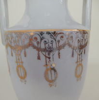 Modelled in the form of an Archaic Greek or Roman vase in high gloss white porcelain with gold gilding. The design features a polychrome stylised image of the waterfront of Nice, capital of the glorious French Riviera. Given the: lack of development, low height of buildings, presence of tramcars (which stopped in 1953) and prominent roof dome of the famous Le Negresco hotel (completed 1913) it would most likely place this image around the 1930’s. The front and rear shoulders have a highly-detailed floral triumphal border (in the French style) in gold gilt. The reverse of the vase is blank.
