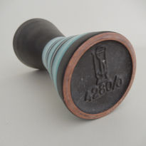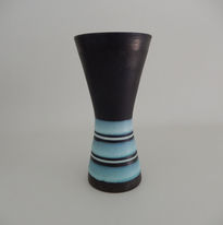 The eye-catching design features a one-piece graduated conical form vase in red clay, externally decorated in a base matt black glaze (having a polished band around the rim) overlaid with five alternating bands of pale turquise and white ‘lava’. The interior is gloss white with uppermost blue corona surrounding the rim.