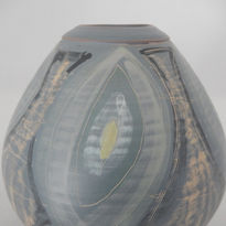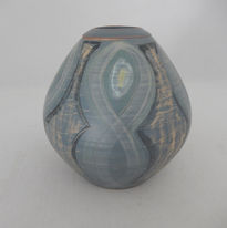 The attractive and tactile design features a low, bulbous vase form in a cream clay with small mouth and heavily applied drip-glazes. The textured body has a primary coffee colour over which has been has been thickly-added cream, cobalt and olive colours.