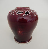 With its deep red oxide high-gloss glaze the colour scheme appears inspired by the famous Royal Doulton ‘Flambe’ ware of the early 20th Century. The body is a compact, broad ‘meiping’ form in fine white clay. Of extra interest is the decision to cut a series of organic, freeform holes around the rim which have then been further highlighted with white slip. These are both wonderfully tactile as well as allowing for broader displays of flowers than a regular, single opening would allow.