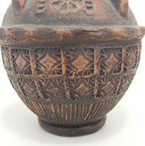 The fun and utterly Mid-Century Modern design features a bulbous form with sleek, curved handle, broad shoulders and wide neck. Two-thirds of the body have a brown glaze with sgraffitto-style finish then a broad, incised band of alternating and repeated impressed geometric patterns (inspired perhaps by Bitossi) and finally a small band repeat of the brown glaze found above. The handle is finished in a very deep (almost black) brown.