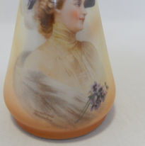 The design features a classical posy vase form with graduated orange overglaze glaze and applied transferprint, the rim having an English sterling silver collar attached (it is unsure if this was done when new, or by a prior owner wanting to add value/appeal). The portrait image is of an Edwardian woman shown mid-torso, wearing a high-neck blouse and fur shawl, with Pompadour/’Gibson Girl’ style hair framed by a voluminous hat with ostrich feathers and flower posy (most likely Forget-Me-Not). A second, floating repeat of the flower posy motif is found across her arms. The wording, ‘Copyright 1907 Philip Boileau’ appears at the base of the shawl.
