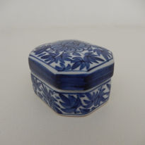 The pretty design features an octagonal, rectangular form externally hand-decorated in blue underglaze with a mid-gloss overglaze. The lid has a stylised lotus flower and/or prunus leaf upper surface with border, the sides having a sold blue gallery. A repeat of the leaf pattern and border is found on the lid (which has a raised lip), the underneath having a Chinese character (that I couldn’t translate but makes it more more interesting - as most examples are blank here).