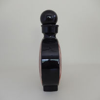 The unusual design features a multi-coloured clay, partially-glazed Chinese ‘Moon Vase’ form with stopper. Each circular side has been left unglazed, allowing for the clay to create a multitude of patterns (can you see the face?). The rest of the body and stopper has been decorated in a high-gloss black glaze – with one side vase having a distinctive crescent element highlighted.