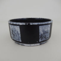 The distinctive design features a low bowl form with an outer matt black ground, decorated by a series of white squares framed by an upper and lower white band. The interior is finished in a black gloss glaze. Its look is very reflective of Brutalist, former-Iron Curtain pottery – and given the horrific role performed by the STASI in spying on its citizens in the DDR, hard not to imagine the squares don’t look like robotic spy camera eyes.