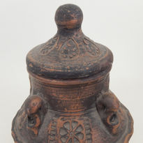 The design features a squat, bulbous red earthenware form with ‘pie crust’ central band with upper portion having four decorative projections, the lid having a raised rounded finial. A mottled matt brown overglaze has been applied. The lid, upper and lower surfaces all have impressed floral, abstract and geometric patterns – along with some vertical sgraffito. The overall look could be roughly be described as ‘tribal/ethnographic’ in style; or perhaps inspired by Italian Bitossi pieces. It allows for appreciation at a variety of angles.