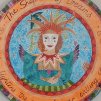 Framing this is a two-tone twist-rope border and outer orange band with the wording, ‘The Shepherd of Dreams. Who lights the way, forever calling come.’. A final multi-coloured external band (in varying greens, purple and browns) completes the image. The outer rim and reverse have a mottled turquoise glaze.