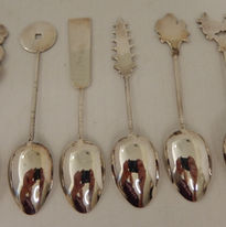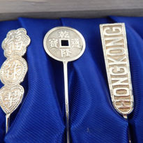 In a high level of detail, this group of spoons provides a mixture of positive Feng Sui symbolism as well as tourist interest. The first contains Chinese calligraphy characters for ‘happiness and longevity’, the second is a Qianlong Tong bao coin (another symbol for long life, representing the peach), the third has ‘Hong Kong’ presented in an elongated bamboo frame, the fourth a five-tier classical Chinese pagoda (a powerful Feng Sui element), the fifth a Chinese junk (forever associated with Hong Kong harbour) and lastly a Chinese woman (wearing a cheongsam and carrying a clutch-purse) being driven in a rickshaw. The shaft of each spoon is made to represent bamboo.