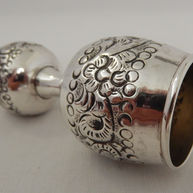 The distinctive design features two repoussé bowl-cup form measures joined by a waisted shaft. Each cup has a hand-applied classical Indian foliate pattern.