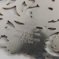 The unusual (most contemporary pieces are circular or ovoid) design features a Neo-Classical Revival border (and pierced feet) of fruiting grape-vines. However what lifts this piece into something extra special is a series of six repeated pierced galleries of acorns and oakleaves (symbols of potential and strength). An overall charming piece that would stand out on any table or sideboard.