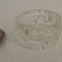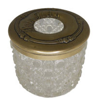The charming design features an (originally silver plated) embossed brass lid with the words ‘Hair Tidy’ surround by a Neo-Classical Revival floral wreath. The base is moulded with hobnail-cut style sides and a star-cut pattern underneath.