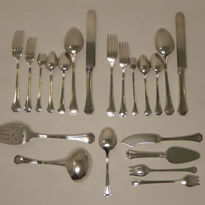 Originally part of a larger service, there are two full settings (each 7 pieces). Also included is a large fish/cake knife, soup spoon, sugar spoon, cheese knife, small fish/cake knife and two pickle forks. Accompanying this are 1 x small fork, 1 x fruit spoon, 3 x teaspoons, 4 x cake knives and 4 x dinner knives. All pieces are stamped ‘Reed and Barton’ and ‘Made in U.S.A.’.