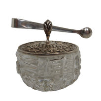 The sweet and charming design features a silver lid and spoon with moulded glass base. The lid features repeated roses and floral elements with a split-blossom terminal (that doubles as the spoon holder), with its glass base having geometric patterns and a star underneath.