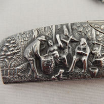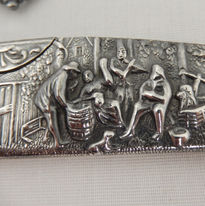 Consisting of a small hand/purse mirror and sleeved comb, the attractive repoussé-applied design of each features a charming rural scene of villagers carousing around a wine barrel. There is lovely attention to the details of country life - with trees, hand-tools, houses, gates/fences and two musicians belting out a tune for a man and woman to dance to. All of this is being patiently observed by a small dog. Cute!
