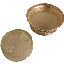 In very good original condition. The lid fits tightly (there is a small amount of patination, which confirms it being a correct vintage and not modern reproduction). The glass base has no cracks or chipping.