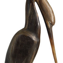 The bird made from horn measures 33.5cm (h) x 9cm (d) x 3.5cm (w) approximately. The wooden statue measures 35.5cm (h) x 9.5cm (d) x 3.8cm (w) approximately.