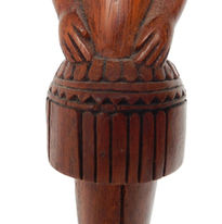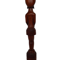 - A female form, carved from a tropical hardwood. The linework of her skirt and around the base is particularly fine. Measures 34cm (h) x 5cm (diameter) approximately.
