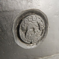 This nicely-detailed design of this particular example provides a charming, seated representation of Budai/Hotei, with his classical associated symbols of good luck, health and prosperity – prominent belly, full drinking cup and large sack (full of fruits and treasures).