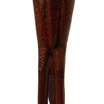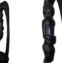 - A Shamanic/totemic sculpture depicting two standing human figures, one supporting the other with both linked by a spirit-dog being. Carved from a single piece of ebonised hardwood. The supporting figure holds a decorated offering, while the smaller has the spirit-dog entering their consciousness (via the larger figure). Given the rounded quality of the carving and totemic symbolism, this is less of a tourist piece and would suggest being closer to WW2 in date. Of particular interest is the sculpting of the smaller figure with their head impossibly rotated 180 degrees (so that it matches the head of the spirit-dog). An elegant work and expertly crafted by hand, not machine-carved like modern pieces. Measures 41cm (h) x 5cm (w) x 3cm (d) (approximately).