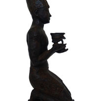The design features a kneeling figure - most likely a high-ranking Egyptian priest. Importantly, they are holding The Eye of Horus (or Wedjat/Udjat eye) a powerful symbol of well-being, healing and protection.