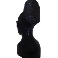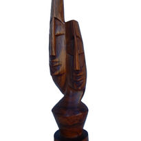 - An unusual statue form, depicting two female figures. Carved from a single piece of ebonised hardwood. The topmost figure is wearing a head-dress and earrings, with the carver using fine notchwork to define limbs and tattoo markings. This figure has a powerful face with great dignity. The supporting figure is uncommon in being double-faced and set at 90 degrees to the figure above, allowing for either to be viewed face-on but not both at the same time. A strong piece with a focus on female power and veneration. Measures 46cm (h) x 8.5cm (d) x 5cm (w) approximately.