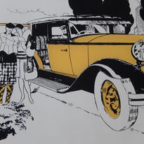 The design features a stylish Art Deco ‘flapper’ couple standing next to their chauffer-driven 1928 Renault Reinastella.