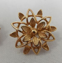 The attractive, contemporary design features a stylised 3-tier floral pattern with alternating solid/open petals that terminate in an outer ring. The metal has been finished in gold gilding/wash.