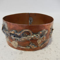Offered for sale is this large vintage 20th Century copper and silver metal cuff bracelet, most likely dating from the 1960’s to 1980’s. Despite research the craftsperson is unknown.